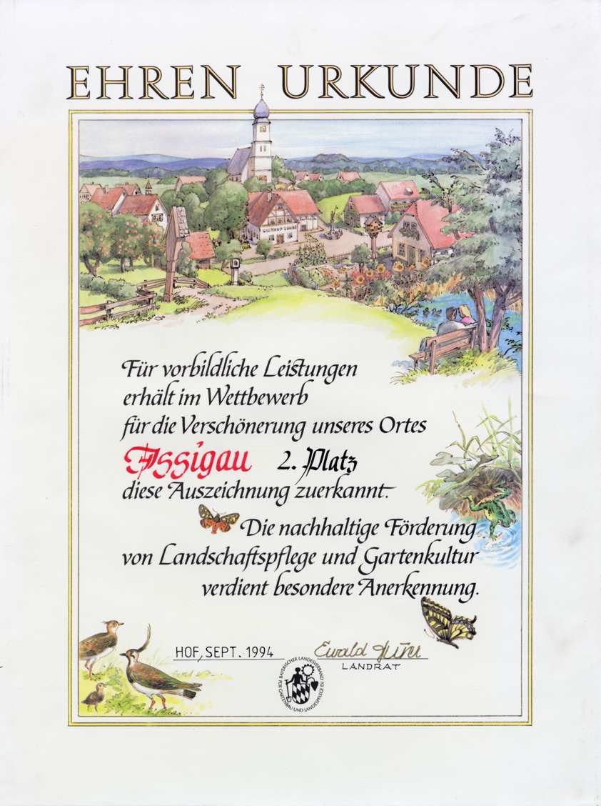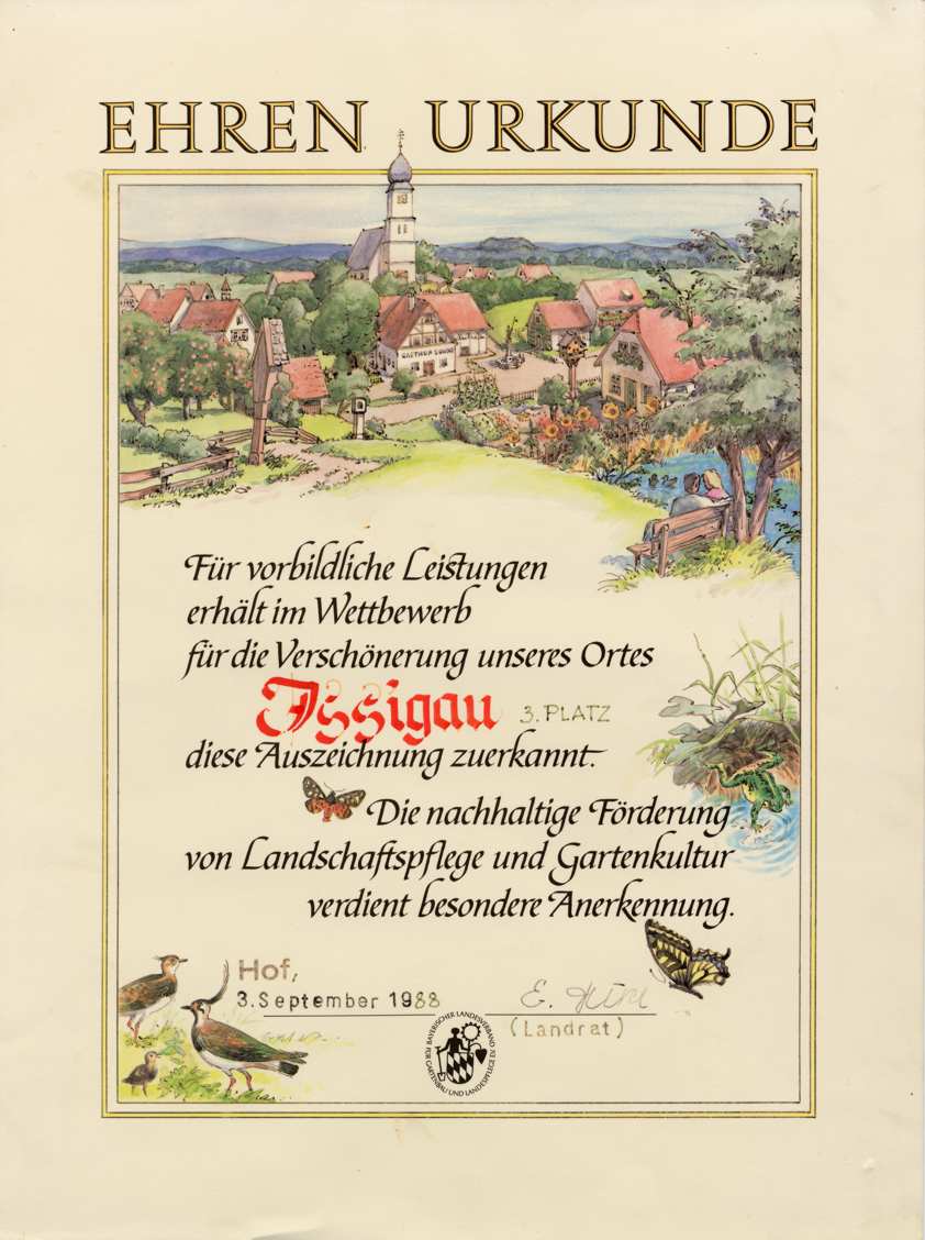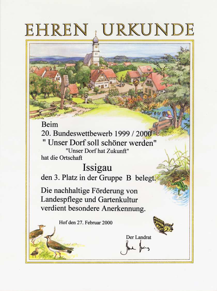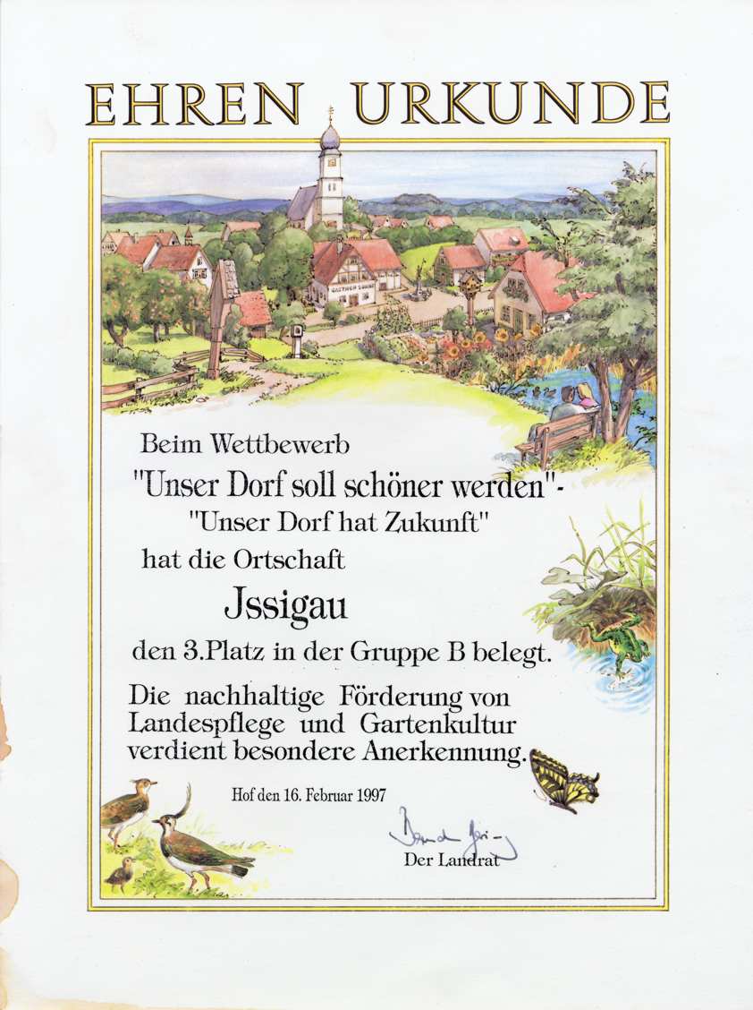 Die Gemeinde Issigau mit Erfolg am Bezirkswettbewerb âUnser Dorf soll schöner werdenâ bzw. âUnser Dorf hat Zukunftâ teilgenommen.